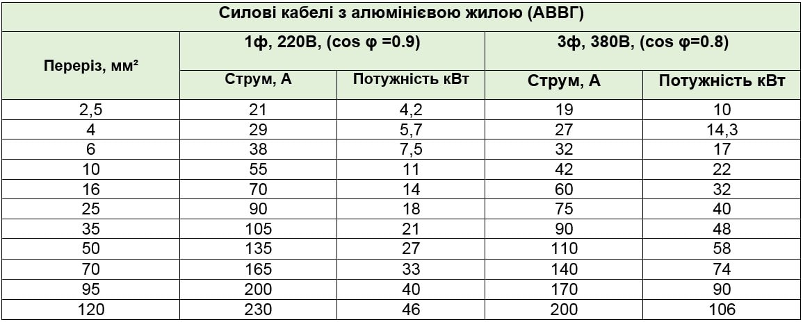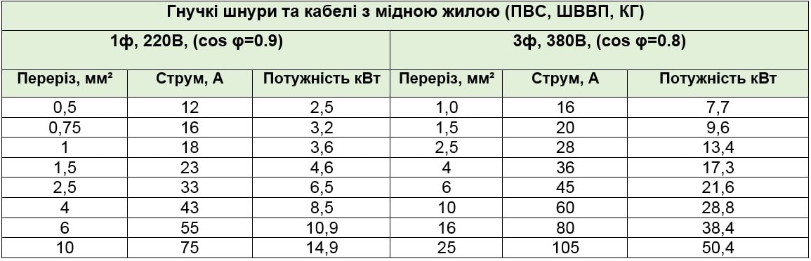Отже, з урахуванням температури, нам потрібен кабель з перетином не менше 0.77 кв. мм.