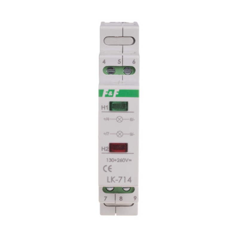 Індикатор двох станів. Два світлодіоди. Кольори: зелений, червоний. Діапазон напруг 130÷260 В AC/DC. Індикатор LK-714 служить для візуальної сигналізації стану зазначених електричних кіл або приймачів, наприклад, закрито - відкрито; робота - перерва, і т. д.