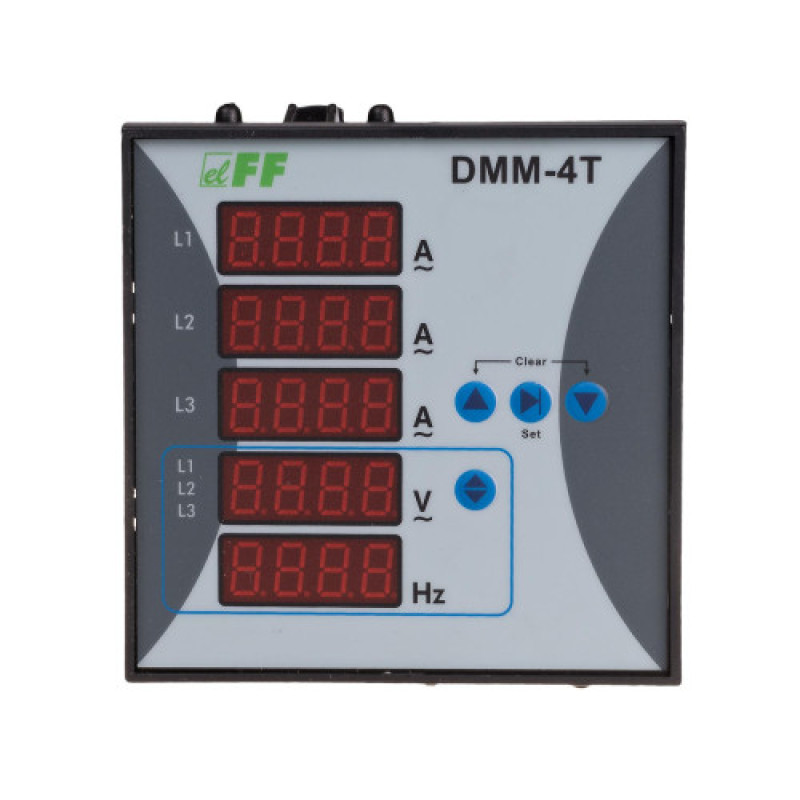 Цифровий мультиметр DMM-4Т призначений для моніторингу параметрів трифазної електричної мережі. Мультиметр показує поточні навантаження всіх трьох фаз, обраних користувачем, напруга однофазна або міжфазова та частота. Вибір параметру відбувається кнопкою, розташованою праворуч від індикатора напруги. Горизонтальна лінія – з лівого боку індикатора напруги визначає фазу, для якої ми проводимо читання фазового напруги. Дві горизонтальні лінії = з лівої сторони індикатора напруги визначають фази, для яких ми виконуємо читання напруги міжфазової.