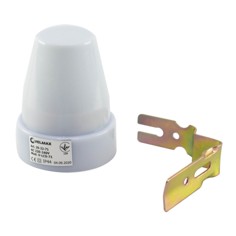 Датчик освітленості ТМ VELMAX призначений для автоматичного вмикання та вимикання джерел світла у відповідностіз рівнем освітленості навколишнього середовища.Застосовується для економії електроенергії при освітленні різних громадських та приватних об’єктів як всерединібудівлі, так і на відкритій території.