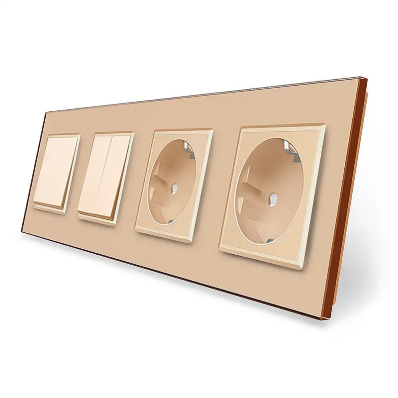Трьохклавішний вимикач (1-2) з подвійною розеткою Livolo золотий скло (VL-C7K1/K2/FCTC16A/FCTC16A-8A