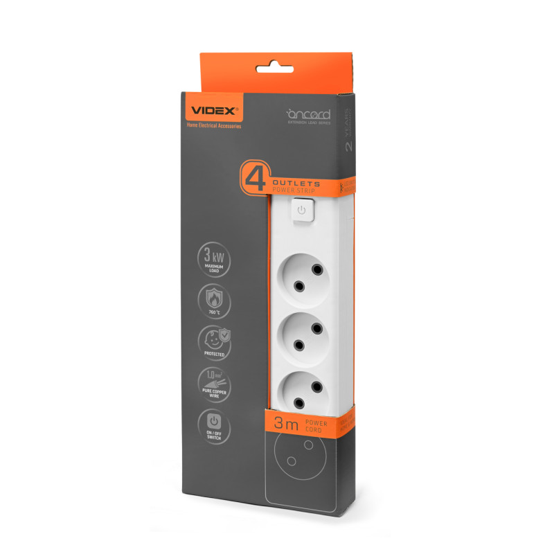 Подовжувач мережевий VIDEX ONCORD б/з 4п 3м з кнопкою білий