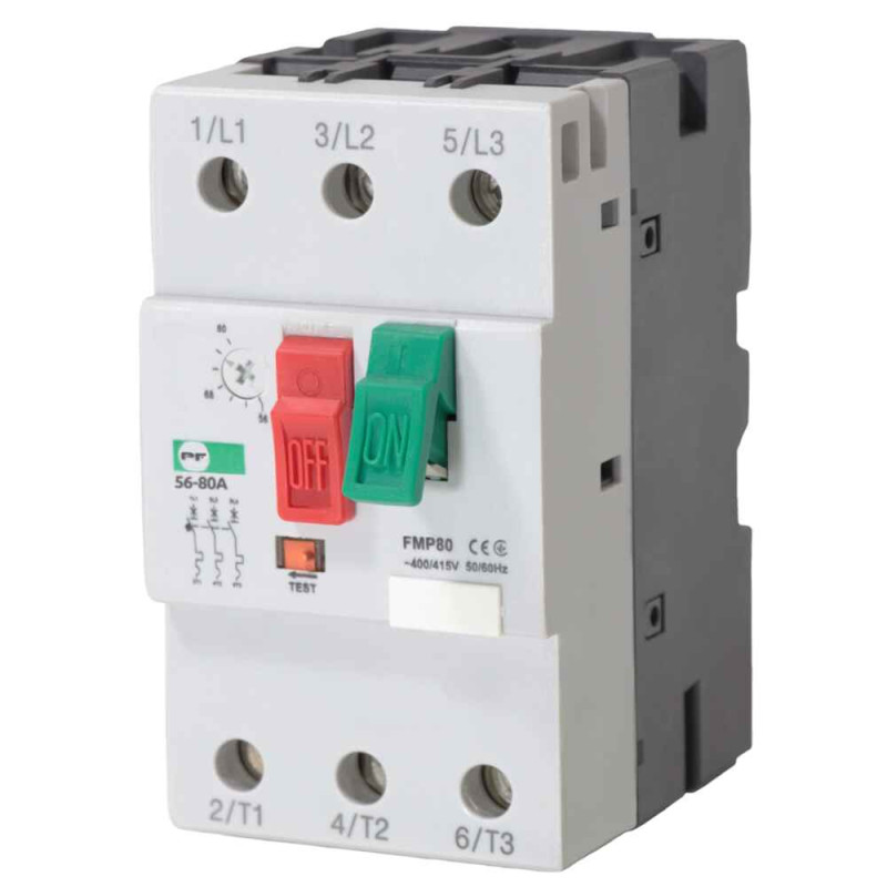 Автомат захисту двигуна ПРОМФАКТОР FMP80 56-80A призначений для пуску і захисту асинхронних двигунів невеликої і середньої потужності (0,37 до 40 кВт) від перевантеження, обриву і асиметрії фаз, тривалого пуску і короткого замикання в колах змінного струму частотою 50/60 Гц напругою до 660В. Пристрій поєднує в собі функції автоматичного вимикача і теплового реле. Випускаються на струми від 0,25 до 80 А.