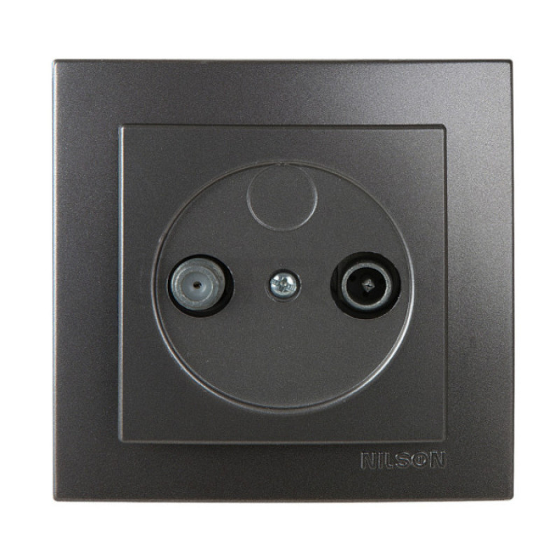 Розетка TV-SAT прохідна NILSON Touran Антрацит - оснащена латунними контактами і зроблена з термостійкого і самозагасаючого пластика. Електрична розетка має класичний дизайн і підійде для будь-якого інтер'єру. Телевізійна та супутникова розетка виконана зі спеціального екологічно чистого матеріалу, який володіє додатковим захистом до ультрафіолетового випромінювання. Розетки і вимикачі Nilson Touran призначені для експлуатації в місцях з нормальним рівнем вологості (ступінь захисту від пилу і вологи - IP20).