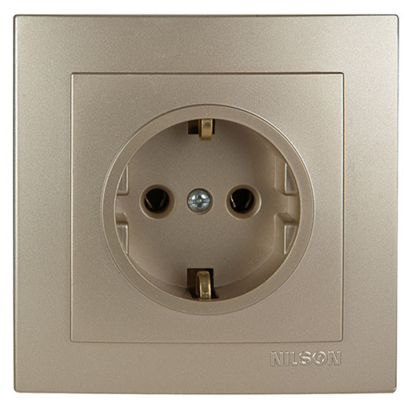 Розетка одинарна з/з NILSON Touran Золото - оснащена латунними контактами і зроблена з термостійкого і самозагасаючого пластика. Електрична розетка має класичний дизайн і підійде для будь-якого інтер'єру. Розетка з заземленням виконана зі спеціального екологічно чистого матеріалу, який володіє додатковим захистом до ультрафіолетового випромінювання. Розетки і вимикачі Nilson Touran призначені для експлуатації в місцях з нормальним рівнем вологості (ступінь захисту від пилу і вологи - IP20).