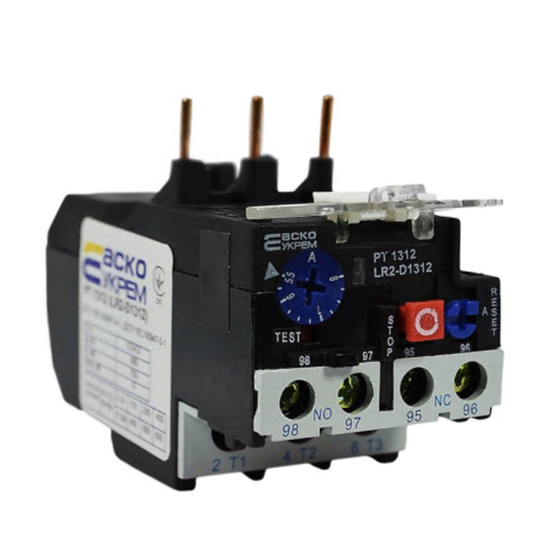 Теплове реле АСКО серії РТ призначено для захисту трифазних асинхронних електродвигунів з короткозамкнутим ротором від надструмів неприпустимої тривалості та несиметричних режимів роботи при пропаданні одної з фаз. Реле монтується безпосередньо на контактор або на DIN-рейку за допомогою адаптера. Терлове реле АСКО має наступні конструктивні особливості: Два режими повернення механізму розчіплення у вихідний стан – ручний або автоматичний. Наявність температурної компенсації. Електрично незалежні замикаючі контакти для сигналізації спрацювання механізму та розмикаючі контакти для вимкнення контактора. Розчіплювач 10 класу, що забезпечує застосування реле РТ для пусків електричних двигунів з часом запуску до 10 сек. Застосовуються з контакторами серії ПМ.