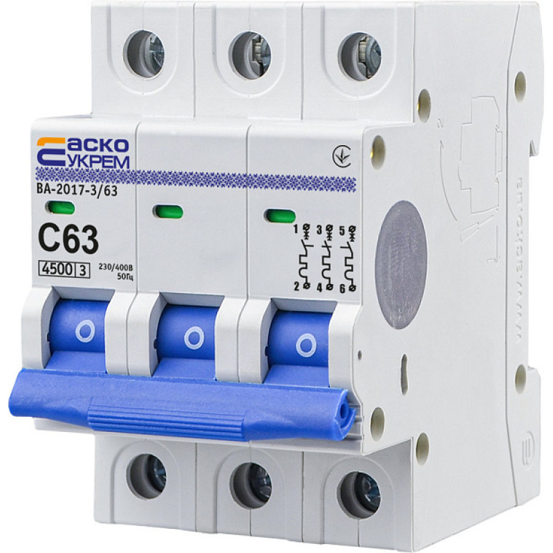 Автоматичний вимикач УКРЕМ ВА-2017/С 3р 63А АСКО - призначений для оперативних комутацій та захисту низьковольтних електричних кіл від тривалих струмових перевантажень і струмів короткого замикання.