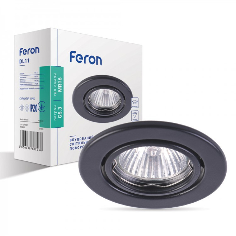 Врізний точковий світильник FERON DL11 MR-16 чорний - стильний та функціональний вибір для освітлення вашого інтер'єру. Завдяки чорному кольору він ідеально впишеться в сучасні або класичні дизайнерські рішення, надаючи приміщенню елегантний вигляд.
