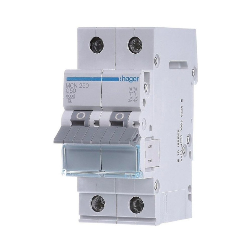 Автоматичний вимикач Hager MCN250 С 2p 50А — це електричний пристрій, призначений для захисту електричних ланцюгів від перевантажень і коротких замикань. Він забезпечує автоматичне вимкнення електроживлення в разі виникнення таких ситуацій, що запобігає можливим пошкодженням обладнання, пожежам та іншим аварійним ситуаціям. Має два полюси 2P і номінальний струм 50A, що означає, що він може витримувати навантаження до 50 Ампер під час роботи в нормальних умовах.