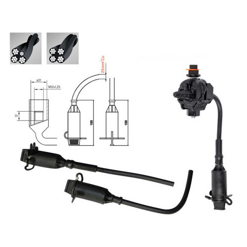Затискач тимчасового заземлення PMCC призначений для підключення вимірювальної напруги, закороток та захисного заземлення під час монтажних робіт на лінії СІП. Затискач встановлюється на струмовідвідних та нульових жилах на початку та в кінці лінії на весь термін служби лінії. Виготовлений із поліаміду, стійкий до атмосферних впливів. Підключається до дроту СІП за допомогою герметичного затискача.Адаптер РМСС сумісний з лініями передач СІП 2 та СІП 4 (напруга до 1 кВ).