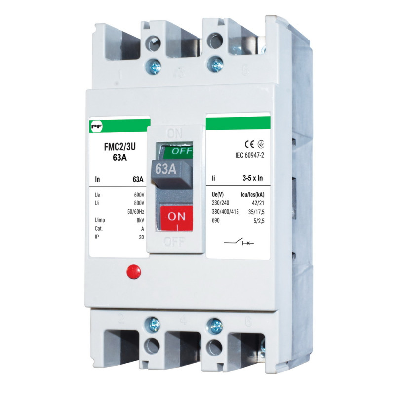 Автоматичні вимикачі FMC2/3U - комутаційні апарати, призначені для захисту електричних мереж від тривалих перевантажень і струмів короткого замикання (надструмів). Можуть використовуватись для оперативного включення і відключення ділянок електричних мереж змінного струму частотою 50Гц напругою до 690В. Конструкція автоматичних вимикачів FMC2/3U передбачає застосування додаткових пристроїв, що монтуються в середину вимикача і значно розширюють функціональні можливості в сфері контролю роботи або керування автоматичним вимикачем. Додаткові пристрої (розчіплювач незалежний РН, розчіплювач мінмальної напруги РМН, контакт додатковий КД, контакт сигнальний КС) у комплект не входять. Також для автоматичних вимикачів FMC2/3U передбачено встановлення додаткових елементів керування: блок дистанційного керування БДКр та ручний дистанційний поворотний привод ПР.
