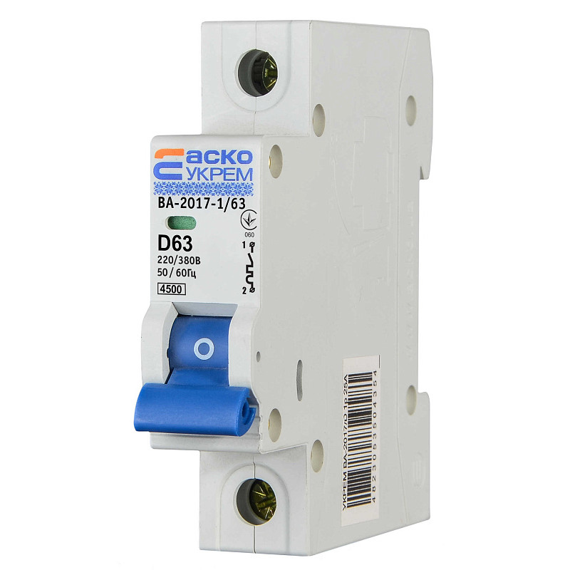 Автоматичний вимикач УКРЕМ ВА-2017/D 1р 63А АСКО (A0010170093) - призначений для оперативних комутацій та захисту низьковольтних електричних кіл від тривалих струмових перевантажень і струмів короткого замикання.