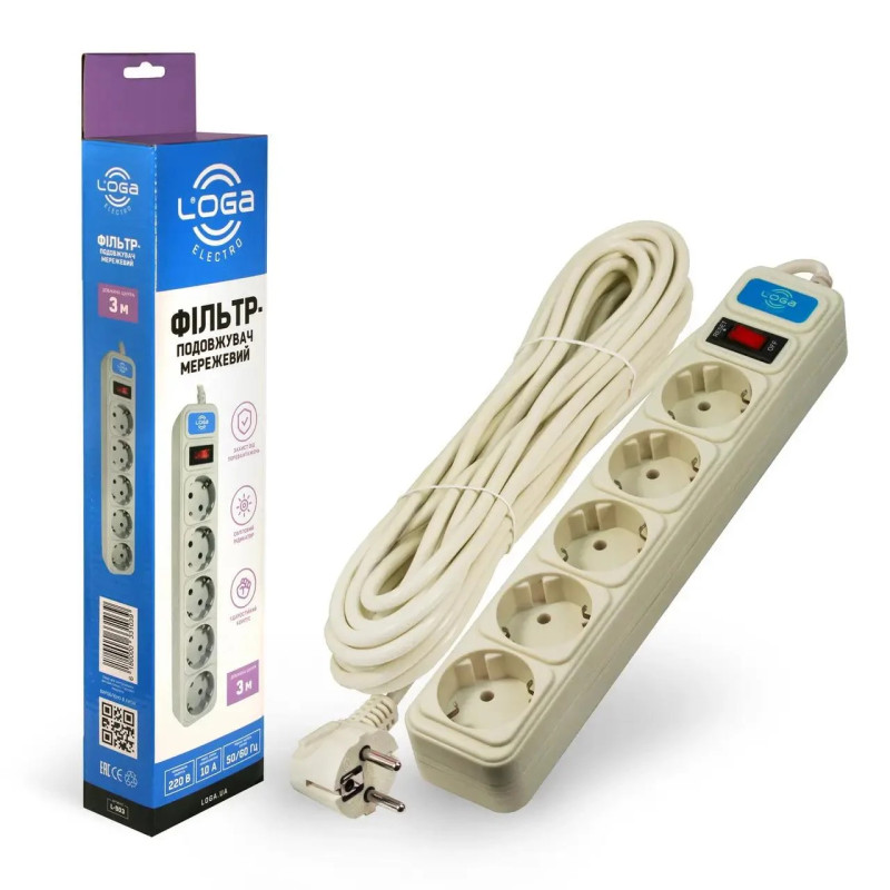 Фільтр LOGA 5 розеток 3 метра 3*0,75мм² 10А 1800Вт (L-903)
