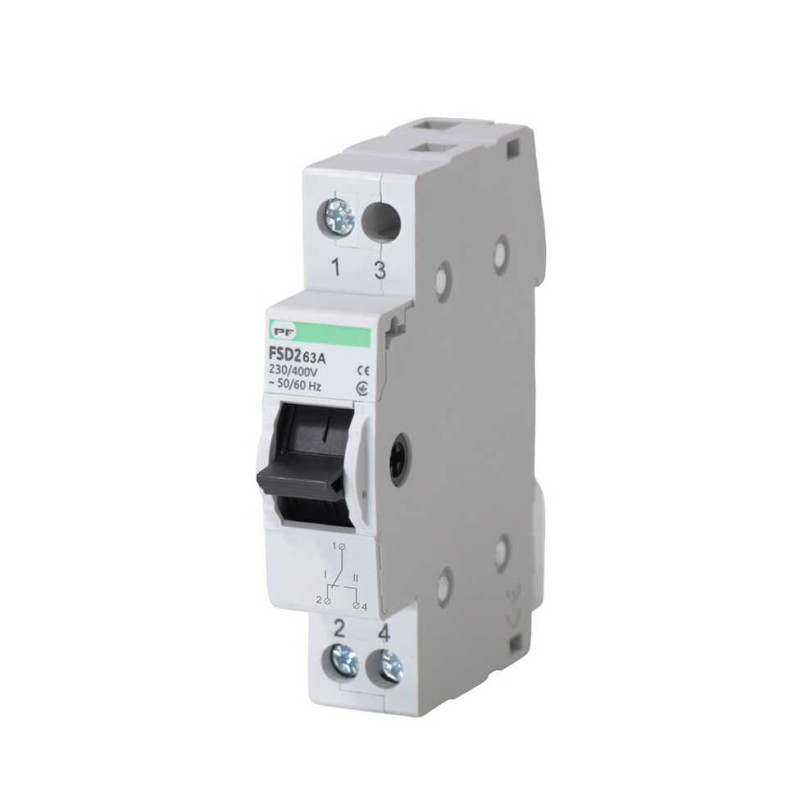 ПеремикачFSD2 1P 63Авикористовується для ручного вибору між мережею 220 В і резервним джерелом живлення, наприклад генератором чи інвертором. Ідеально підходить для приватних будинків, котелень, насосних станцій, офісів, складів і промислових об’єктів, де важлива стабільність і безперебійність енергопостачання.