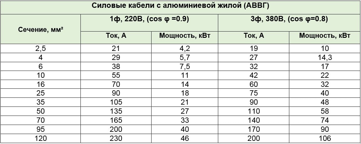 Итак, с учетом температуры, нам нужен кабель с сечением не менее 0.77 кв. мм.
