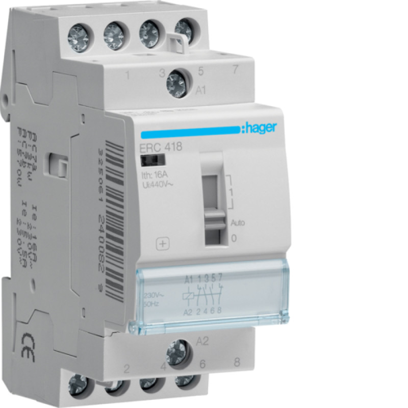Контактор с ручным управлением — надежное и высококачественное электротехническое устройство, предназначенное для управления электрическими цепями. Модель ERC418, произведенная компанией Hager, имеет 4 полюса с номинальным током 16A и включает в себя 2 нормально открытых (NO) и 2 нормально закрытых (NC) контакта, что делает ее идеальным решением для различных электрических систем.