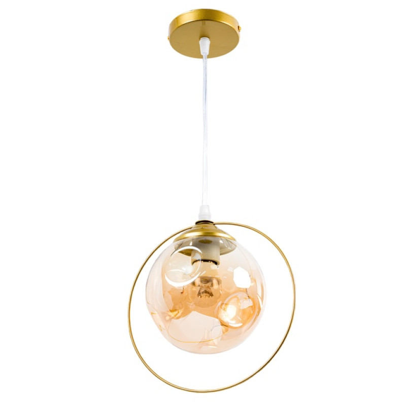 Металлический каркас в золотистом цвете придает люстре изящества и стойкости. Прозрачно-золотистый стеклянный плафон придает свету и легкости, рассеивая его равномерно по помещению. С цоколем E27 у вас есть свобода выбора лампочки, что открывает возможности для создания уникального освещения.