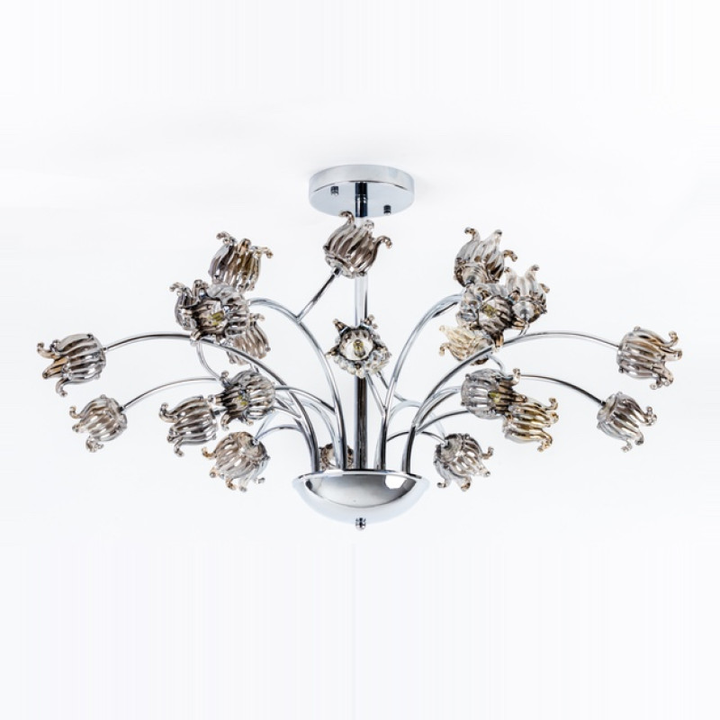 Современный дизайн: Каркас из металла в цвете хрома поражает своей современностью и элегантностью. С 24 плафонами в форме маленьких цветочков из стекла, эта люстра создает невероятный артобъект в вашем помещении.