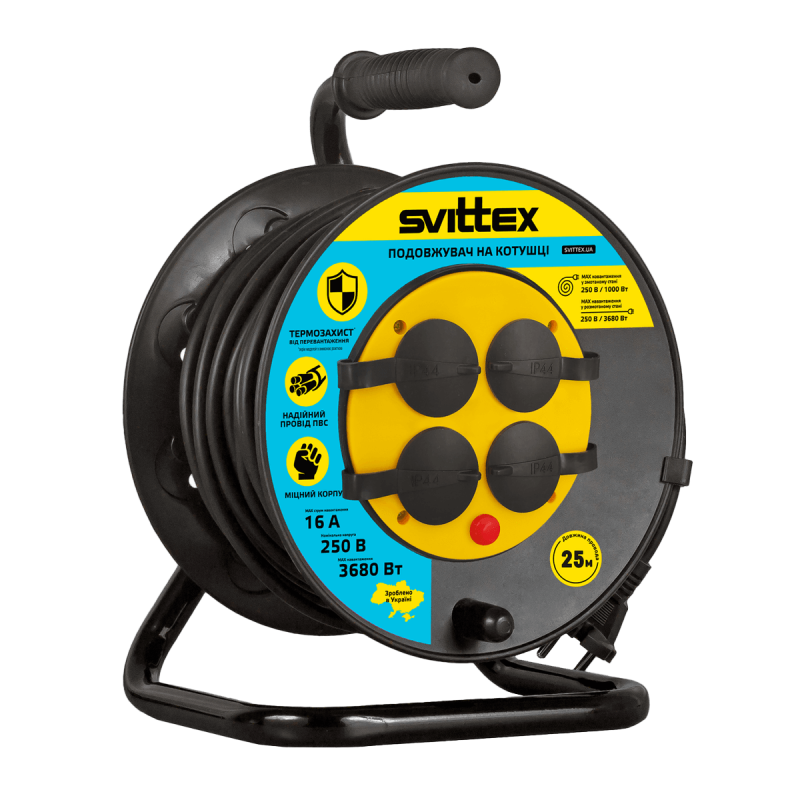 Удлинитель на катушке Svittex с термозащитой и защитой IP44 25 м 2х1,5 мм2 (SV-004-В-IP44)