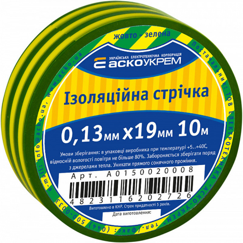 Изоляционная лента 0,13мм*19мм/10м желто-зеленая АСКО-УКРЕМ A0150020008