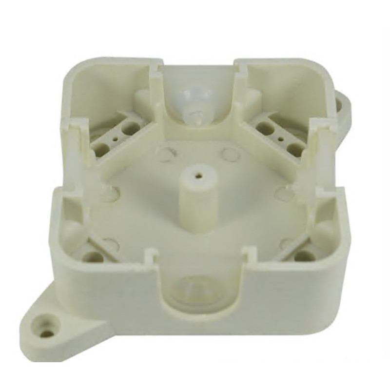Корпус квадратной формы серого цвета выполнен из ПВХ, который способен выдерживать широкий диапазон температур и устойчив к внешним воздействиям. Изделие также имеет специальные отверстия по бокам, для подвода проводов, а сверху коробка закрывается крышкой.