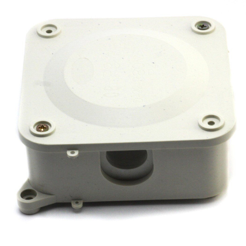 Корпус квадратной формы серого цвета выполнен из ПВХ, который способен выдерживать широкий диапазон температур и устойчив к внешним воздействиям. Изделие также имеет специальные отверстия по бокам, для подвода проводов, а сверху коробка закрывается крышкой.