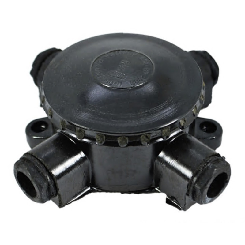 Корпус круглой формы черного цвета выполнен из карболита, который способен выдерживать широкий диапазон температур и устойчив к внешним воздействиям. Изделие также имеет специальные отверстия по бокам, для подвода проводов, а сверху коробка закрывается крышкой.