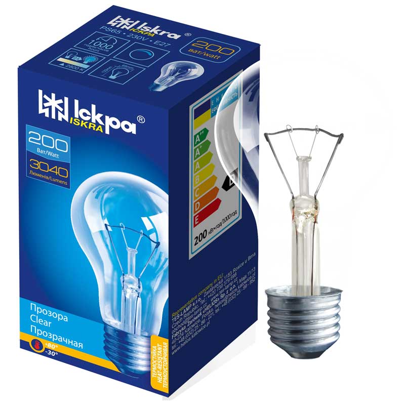Стандартная лампа накаливания ИСКРА А65 200Вт Е27 относительно компактная, зачастую используется в светильниках без абажуров, или ограниченным пространством внутри плафона.
