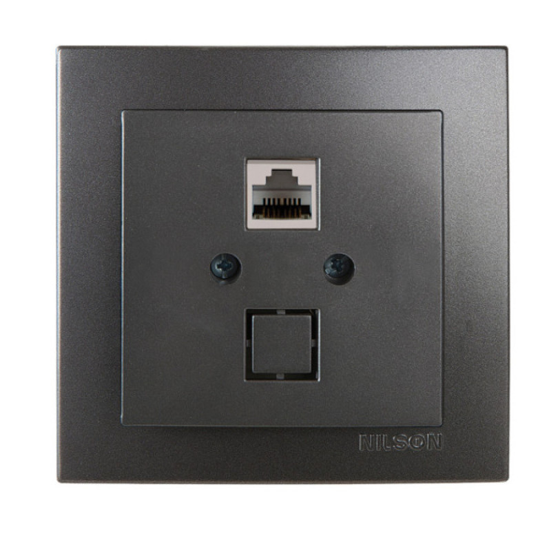 Розетка компьютерная CAT5e NILSON Touran Антрацит - оснащена латунными контактами и сделана из термостойкого и самозатухающего пластика. Электрическая розетка имеет классический дизайн и подойдет для любого интерьера, rj45 розетка выполнена из специального экологически чистого материала, обладающего дополнительной защитой к ультрафиолетовому излучению. Розетки и выключатели Nilson Touran предназначены для эксплуатации в местах с нормальным уровнем влажности (степень защиты от пыли и влаги - IP20).