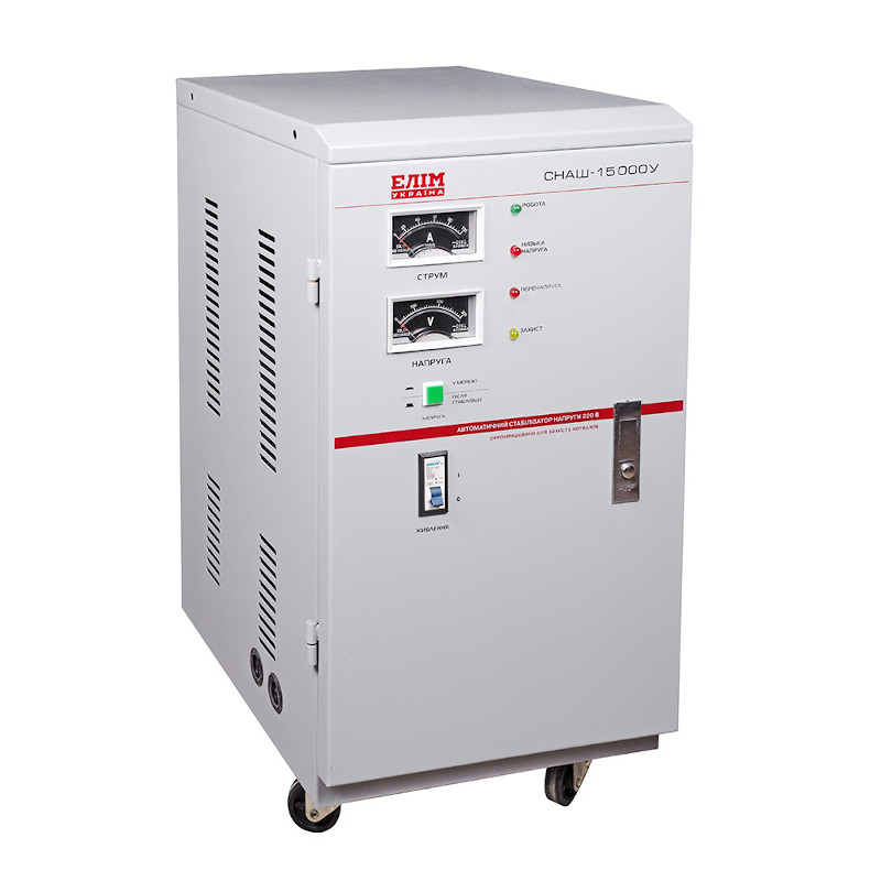 Стабилизатор напряжения СНАШ-15000 — предназначен для защиты бытовых и промышленных электроприборов от резких и значительных скачков напряжения и перебоев с подачей энергии в питающей сети. Необходим для оборудования, требующего надежного электропитания, сбои в работе которого, могут вывести его из строя, привести к аварийной ситуации, повреждению имущества, остановки технологического процесса.