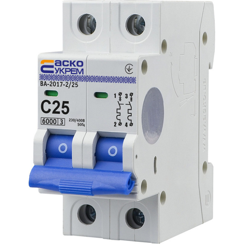 Автоматический выключатель АСКО-УКРЕМ ВА-2017 2P 25А C предназначен для оперативных коммутаций и защиты низковольтных электрических цепей от длительных токовых перегрузок и токов короткого замыкания.
