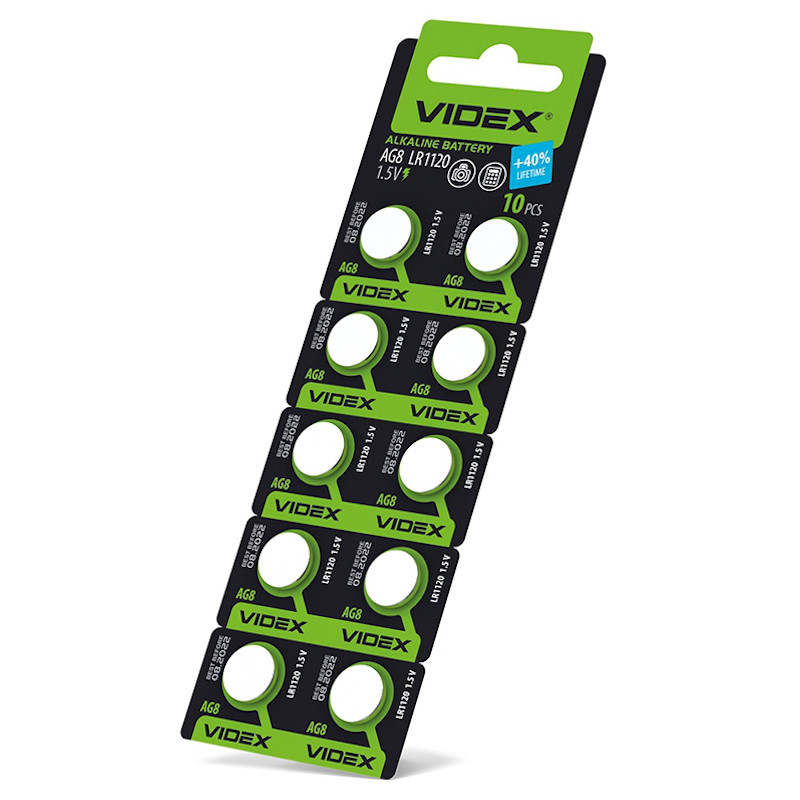 Батарейка VIDEX AG8 LR1120 — это миниатюрное одноразовое изделие, обладающее номинальным напряжением 1,5В. Произведена для применения в устройствах разных типов — от сложных цифровых приборов с высоким энергопотреблением, до самых примитивных и потребляющих мало энергии, например, кухонные и напольные весы, игрушки, калькуляторы, медицинские приборы, дистанционные ключи и другое.