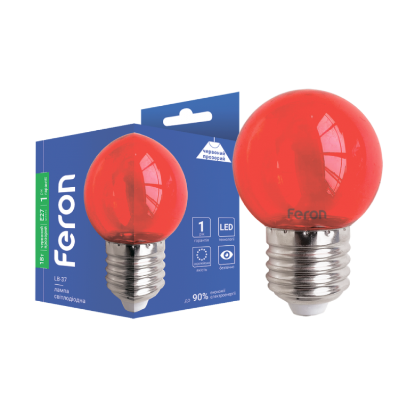 Светодиодная лампа FERON LB-37 G45 1W E27 красная прозрачная предназначена для использования в гирляндах белт-лайта и декоративного освещения в помещениях наружу.