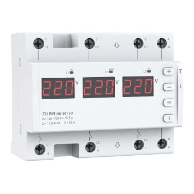 Трифазное реле напряжения ZUBR 50А D6-50 RED — предназначено для защиты бытового и промышленного электрооборудования и может работать в режимах: однофазной или трехфазной нагрузках.