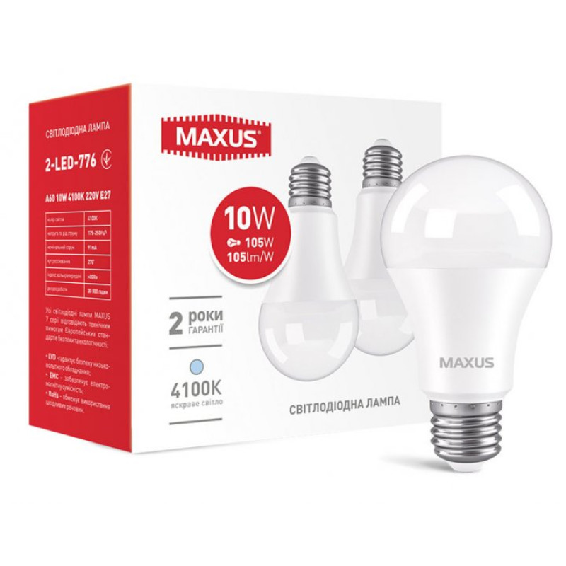 Набор светодиодных лампочек MAXUS A60 10W 4100K 220V E27 2-LED-776