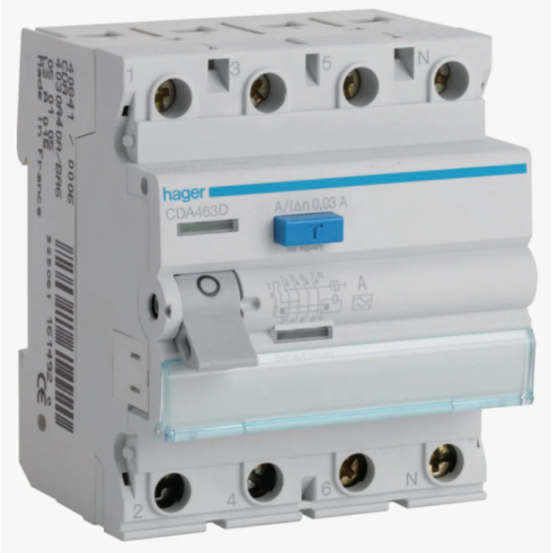 Устройство защитного отключения (УЗО) CDA463D 4P 63A 30mA тип A Hager предназначено для оперативного отключения сети при достижении заданной величины тока утечки на землю. Прибор обеспечивает защиту от поражения электрическим током при прикосновении, а также защищает оборудование при повреждении изоляции.