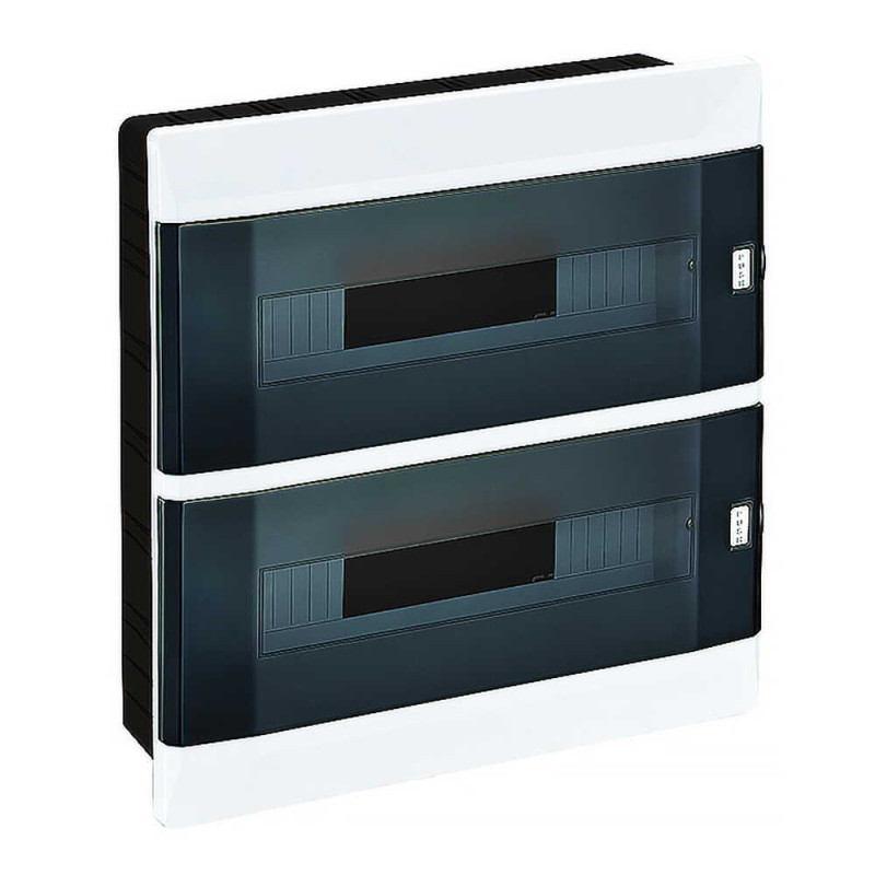 Изделие изготовлено из термостойкого пластика, обеспечивающего высокую прочность и стойкость к температурным колебаниям. Дизайн выполнен в белом классическом цвете, гармонично вписывающемся в любой интерьер. Бокс имеет класс защиты IP40, что гарантирует определенную защиту от пыли и механических повреждений. Его размеры составляют 330×300×80 мм. Тип монтажа – врезной, позволяющий спрятать конструкцию в стену, сохраняя эстетичность помещения. Бокс оснащен черной непрозрачной дверцей, обеспечивая быстрый доступ к внутренней части для обслуживания или обновления.