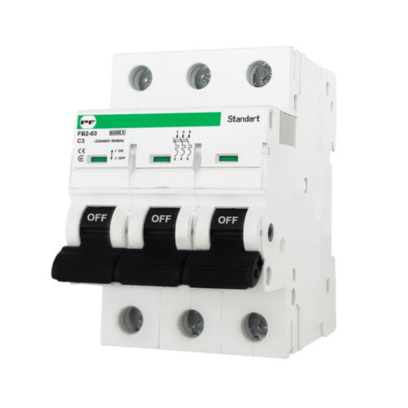 Модульные автоматические выключатели FB2-63 (Standart) предназначены для защиты низковольтных электрических цепей от перегрузки и токов короткого замыкания, а также для оперативного включения и отключения электрических цепей переменного тока частотой 50 Гц напряжением 230/400 В. Рекомендуется применять на промышленных и бытовых объектах. Автоматические выключатели FB2-63 (Standart) доступны в двух характеристиках С (номиналом от 1 до 63 А) и D (номиналом 80 A, 100 А). Возможны следующие конфигурации автоматов: 1P, 2P, 3P. Он способен выдержать ток короткого замыкания до 6кА (при 230/400 V AC).