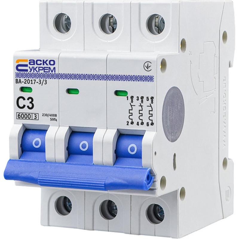 Автоматический выключатель УКРЕМ ВА-2017/С 3р 3А АСКО (A0010170040) - предназначен для оперативных коммутаций и защиты низковольтных электрических цепей от длительных токовых перегрузок и токов короткого замыкания.
