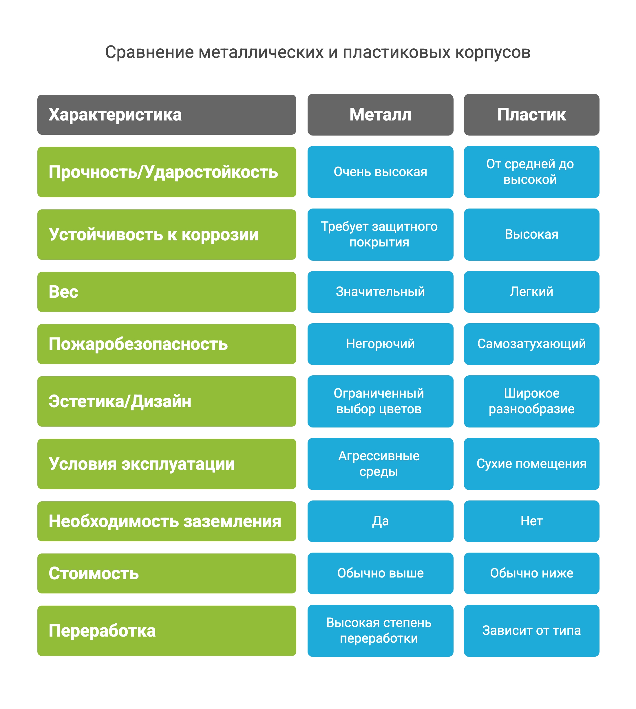- Материал корпуса. Металл — максимальная прочность и пожаробезопасность. Пластик — эстетичность, отсутствие коррозии и необходимости заземлять корпус.