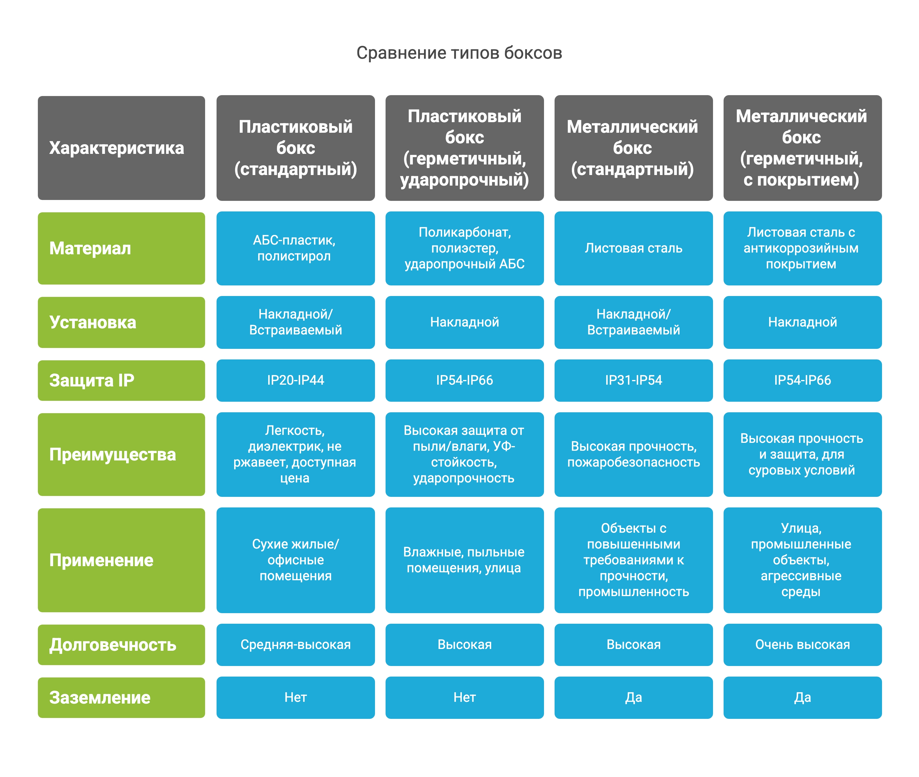 - Материал: Металл — для жестких условий, производства и антивандальной защиты. Пластик — для влажных помещений, улицы (если стойкий к УФ) и радиооборудования.