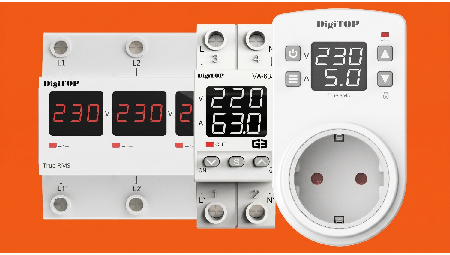 Типові моделі для квартири: DigiTop VP-63A, ZUBR D63, Новатек-Електро РН-106. Вибір за струмом: для стандартної квартири достатньо 32-63А. Для будинку з потужними споживачами (котел, теплова помпа) — 63-100А.