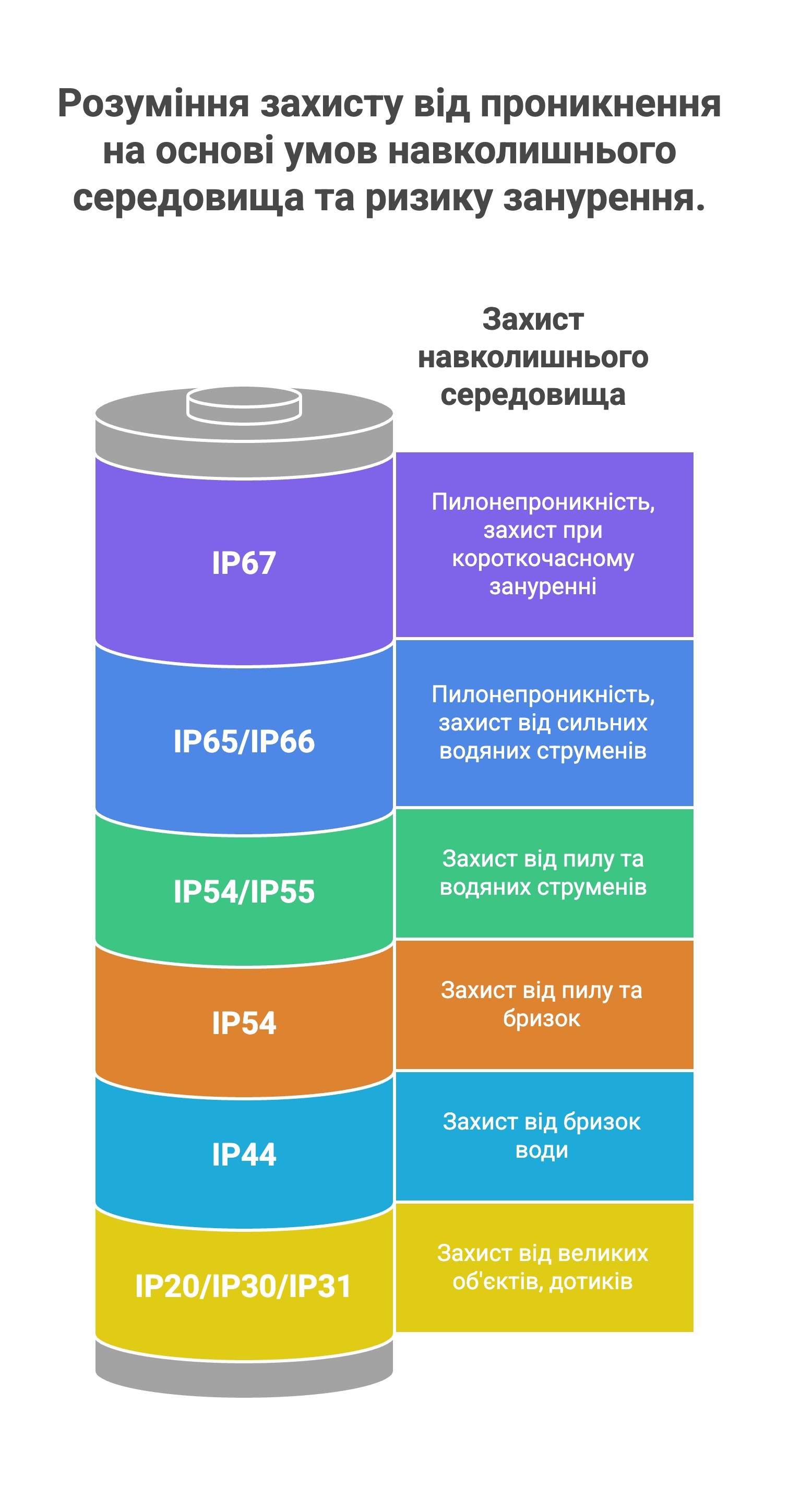 - Ступінь захисту (IP). Вказує на герметичність. IP20-31 — для сухих приміщень, IP44-54 — для вологих, IP65 — повний захист від струменів води та пилу.