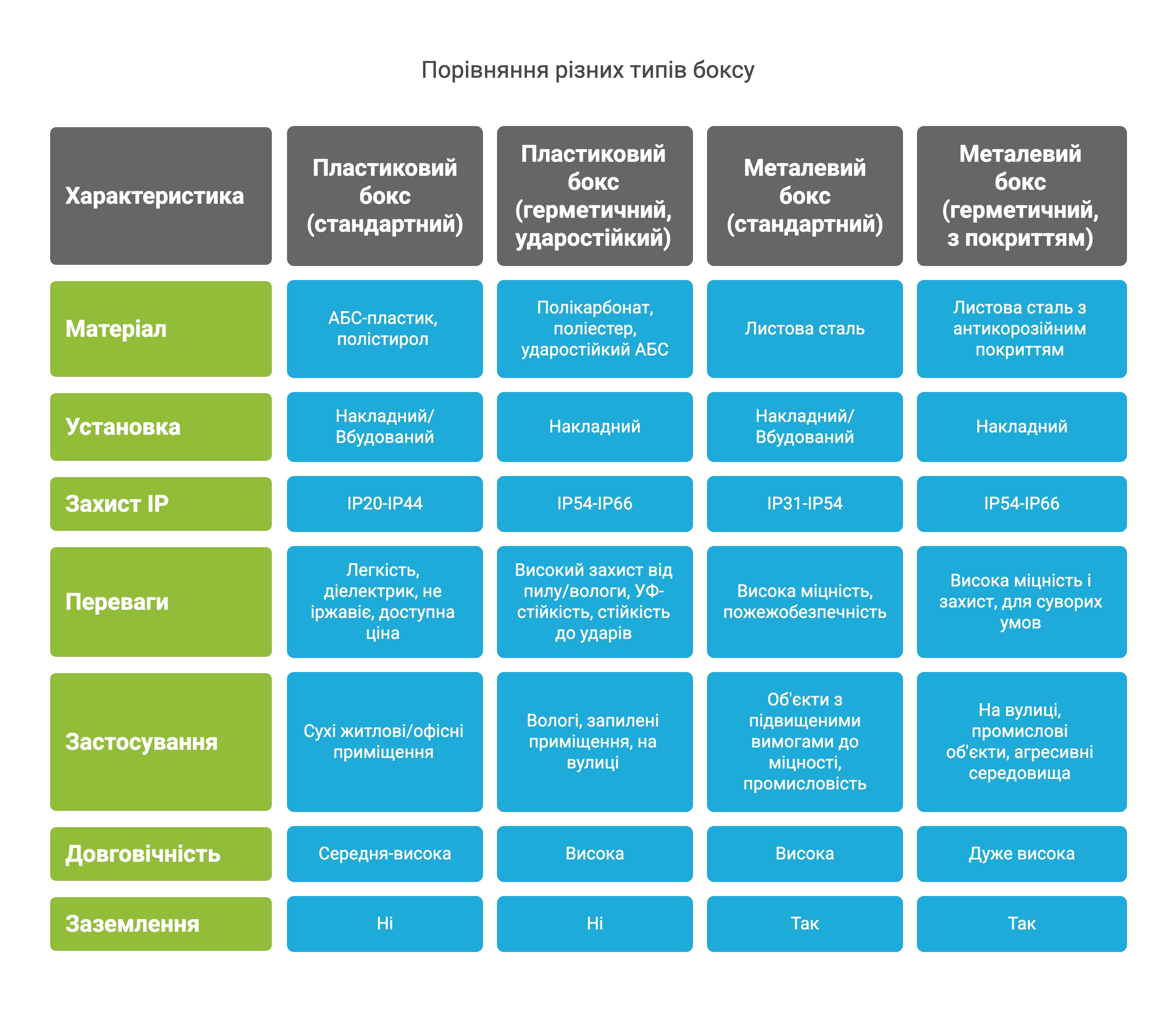 - Матеріал: Для вулиці, гаража або виробництва краще брати метал або посилений поліестер (антивандальні). Для приміщення, офісу або Wi-Fi обладнання — ABS-пластик.